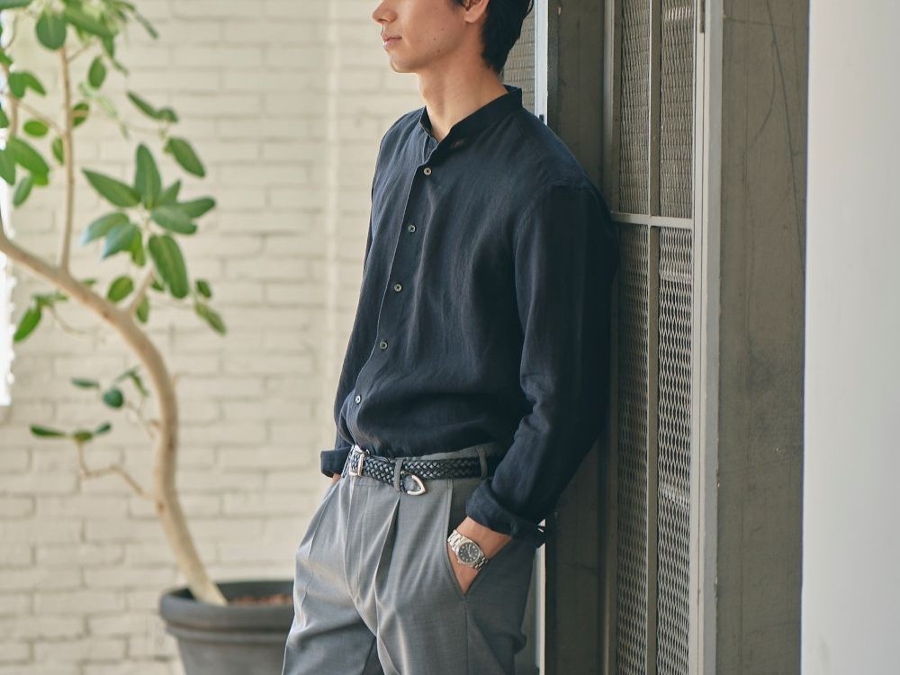「色」で印象を変える場合は、グレー、ネイビー、ブラウン、ピンク、パープルといった「新定番」とも言えるカラーのシャツを試してみましょう。「素材」の表情で新鮮に演出しながら、快適性や機能性をプラスするのもおすすめ。リネンや高機能素材を取り入れたシャツは、通気性や吸湿速乾性に優れているため、夏でも快適に過ごせます。「デザイン」で新鮮に演出する際は、カジュアル感がプラスできる「バンドカラー」や、清潔感が打ち出せる「クレリックシャツ」などを活用するのがおすすめです。